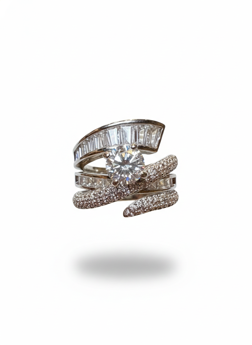 This ring showcases a brilliant central stone cradled between two flowing pavé-set bands, creating a soft, sculptural elegance. A row of baguette-cut stones beneath adds a refined architectural glow. Bold yet graceful, it sparkles with modern sophistication.