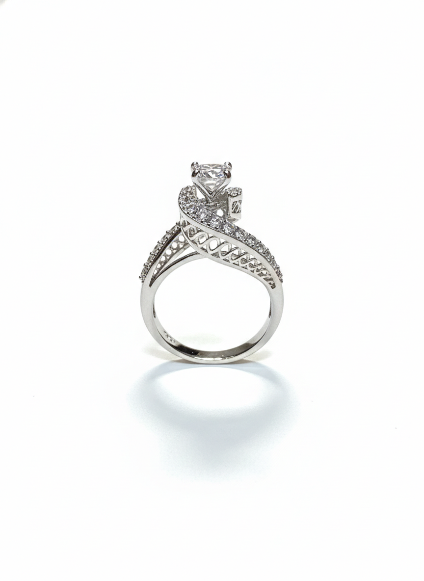This ring features a graceful, intertwined band design that wraps around the finger like a delicate embrace, each curve shimmering with pavé-set stones. At its centre sits a brilliant solitaire, elevated with airy elegance and framed by soft, sculptural lines. Modern, romantic, and effortlessly refined—it’s a piece that sparkles with quiet sophistication.