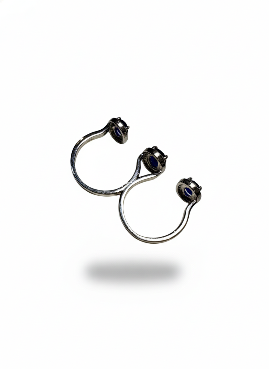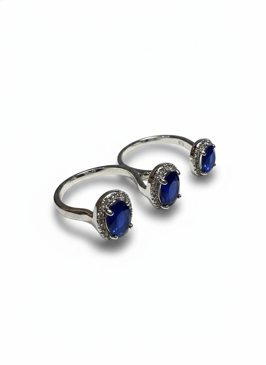 This ring features a deep midnight-blue oval stone encircled by a delicate halo of shimmering A1 quality crystals, creating a timeless and regal allure. The rich color contrasts beautifully with the radiant frame, giving it a look of quiet sophistication. Elegant, classic, and effortlessly graceful—this piece carries the charm of a jewel meant to be treasured.