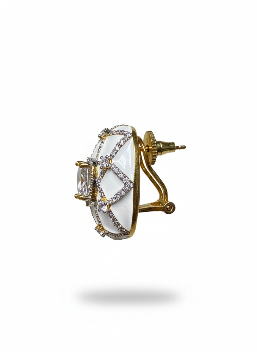 These earrings blend modern artistry with timeless charm, featuring a soft ivory base framed by a delicate lattice of shimmering stones. At the center, a brilliant crystal blooms like a flower captured in perfect symmetry. Refined, graceful, and effortlessly luxurious, they add a touch of quiet sophistication to any look.