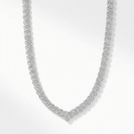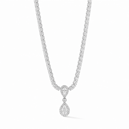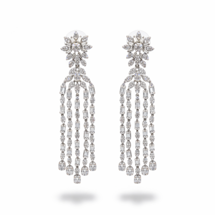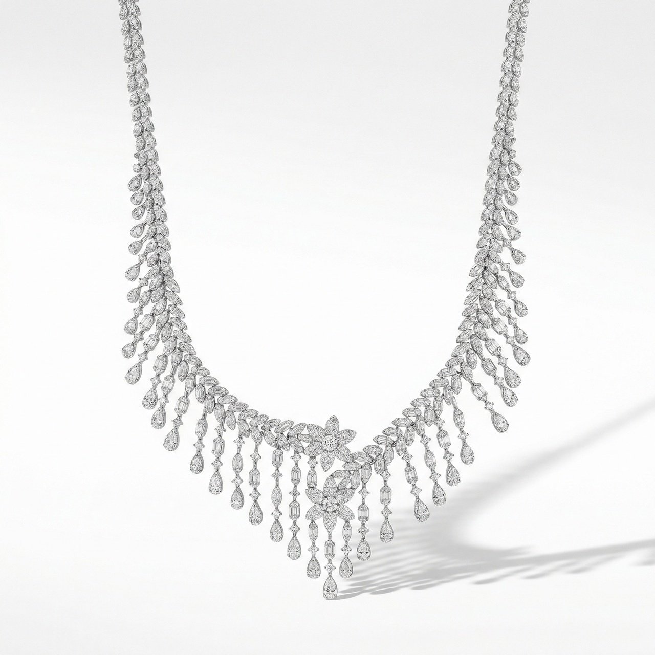 A breathtaking necklace featuring cascading crystal drops that create a waterfall effect around the neckline. The center floral cluster adds a regal touch, while the matching earrings complete the look with graceful movement and radiant sparkle.