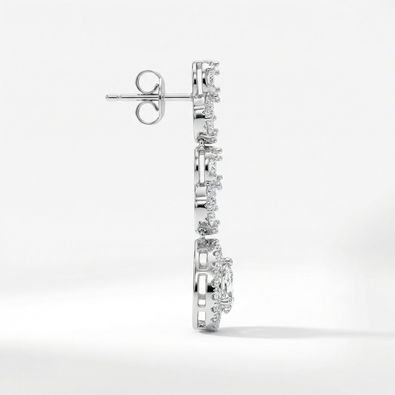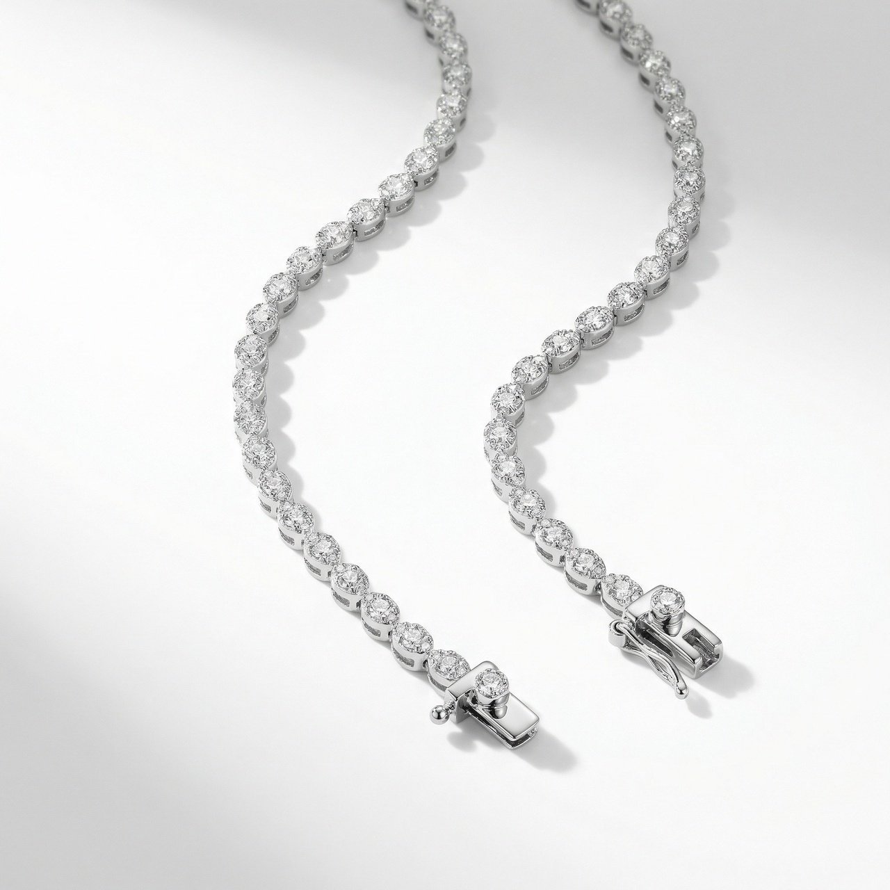 A timeless jewellery set featuring a graceful necklace made of sparkling round-cut stones linked in a delicate sequence, leading to a striking halo pendant that captures and reflects light beautifully. The matching earrings mirror the same halo-style centrepiece, creating a cohesive look of sophistication. Perfect for formal occasions, celebrations, or bridal wear—this set adds refined glamour without overpowering your outfit.