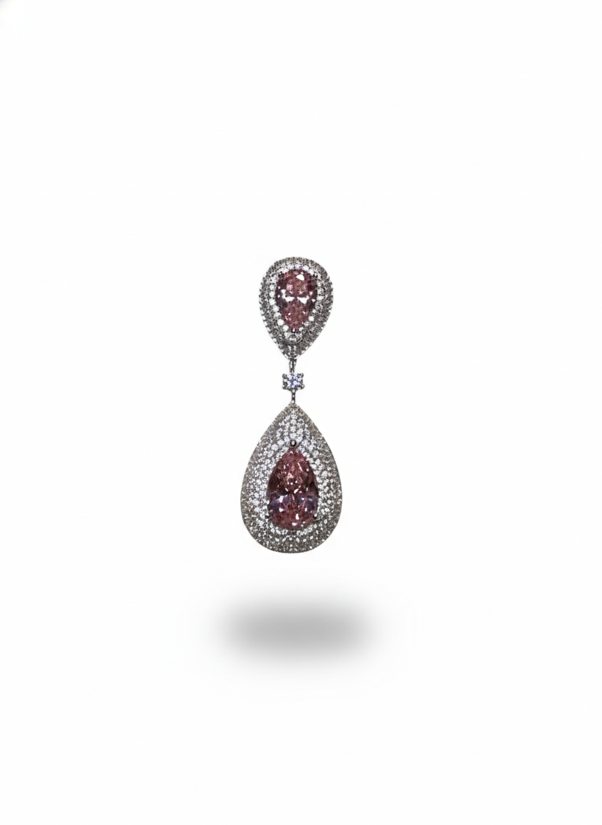 These earrings showcase magnificent pink pear-cut stones framed by layers of dazzling pavé, giving them a regal, luminous presence. The double-drop silhouette creates graceful movement, while the intricate sparkle adds depth and sophistication. Bold yet exquisitely feminine, they are designed to make every moment feel grand.