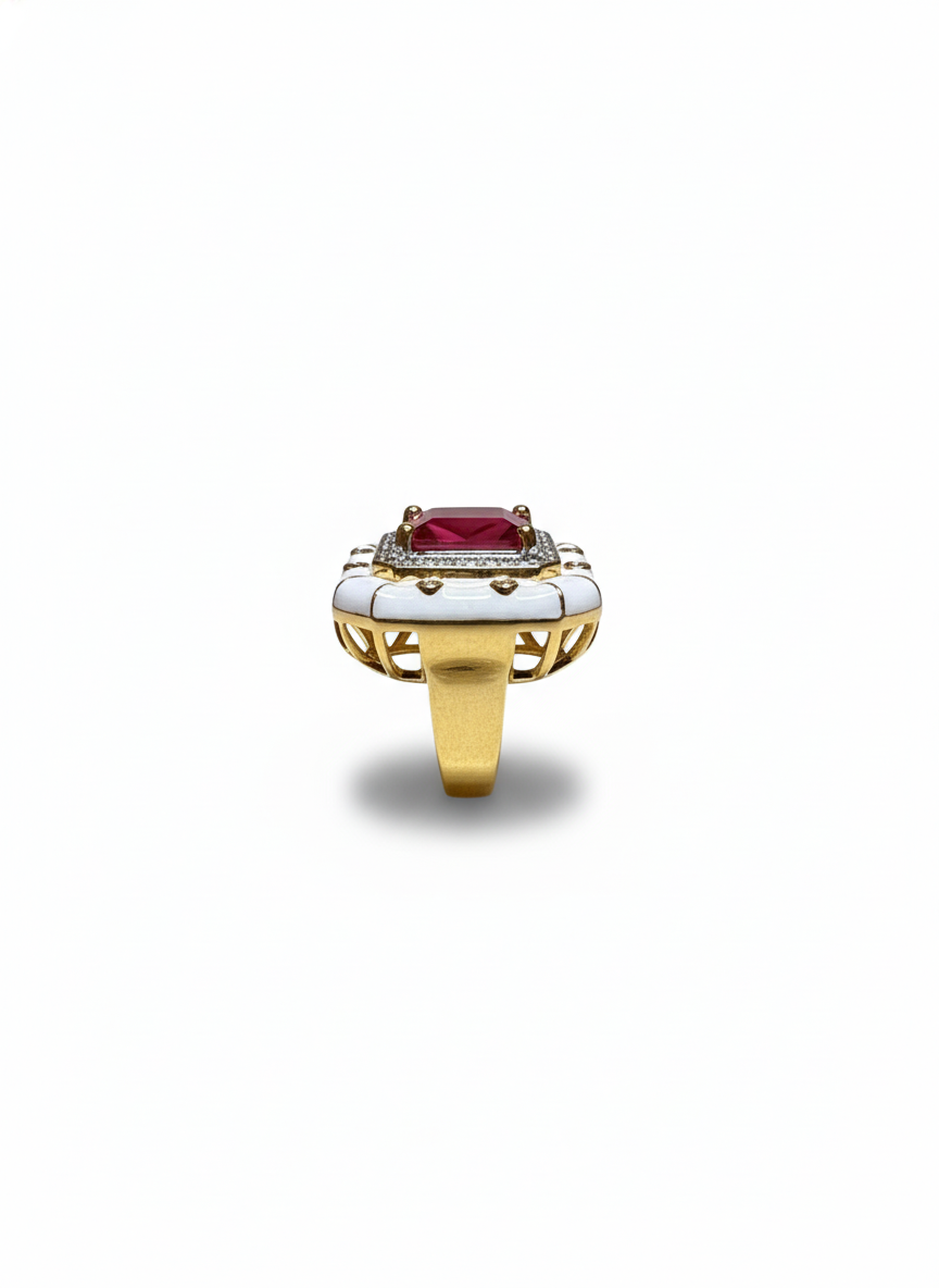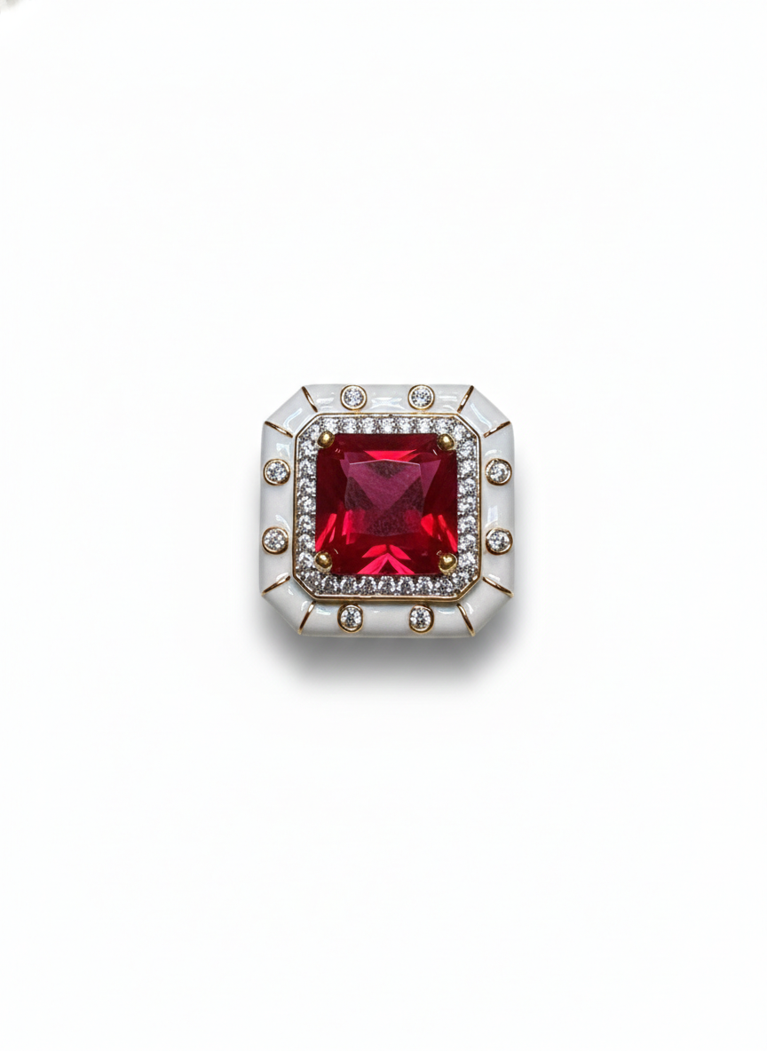 This ring commands attention with its rich, square-cut scarlet stone framed by a luminous border of diamonds set in an elegant white enamel design. The contrast of deep red against the crisp white creates a regal, vintage-inspired charm. Bold, sophisticated, and unmistakably luxurious, it feels like a jewel crafted for modern royalty.