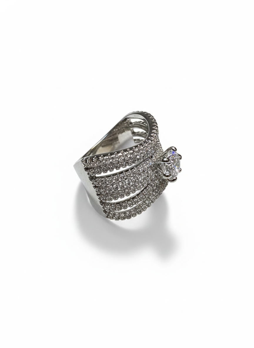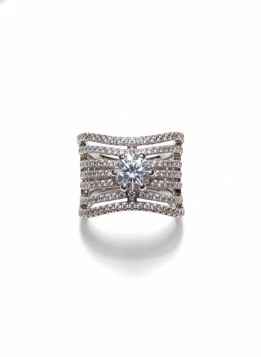 This ring features a mesmerising lattice of shimmering pavé lines that curve gracefully toward a radiant central stone, creating the illusion of a star captured in a jewelled frame. Its architectural design feels both modern and ethereal, offering a perfect blend of structure and sparkle. Bold, artistic, and luminously refined—this piece truly stands out.