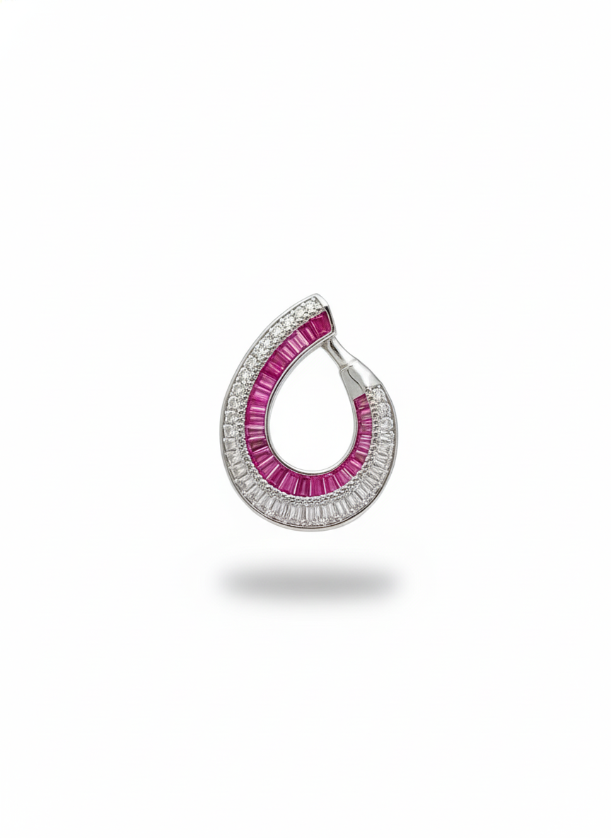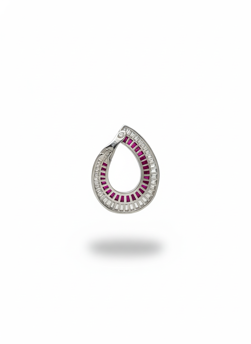 These striking earrings feature elegant crescent silhouettes lined with vivid ruby-hued stones, framed by shimmering baguette diamonds that amplify their brilliance. The bold curve gives them a sculptural, contemporary charm while the rich colors add a regal touch. Distinctive, radiant, and exquisitely crafted—perfect for making a statement with sophistication.