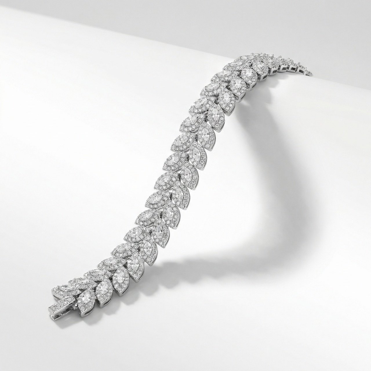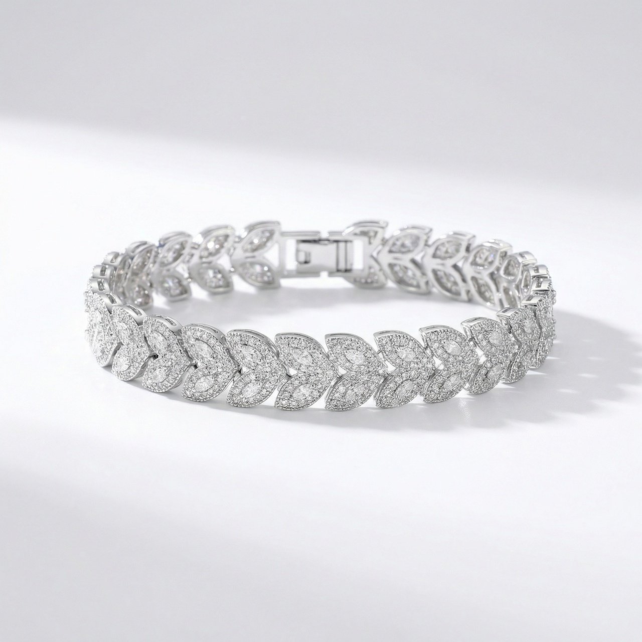 A dazzling bracelet crafted with leaf-shaped clusters of shimmering stones, arranged in a flowing vine pattern. Its gentle curve and brilliant sparkle give it an elegant, nature-inspired luxury look — perfect for special occasions or statement styling.