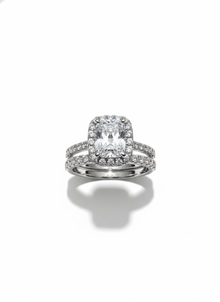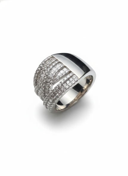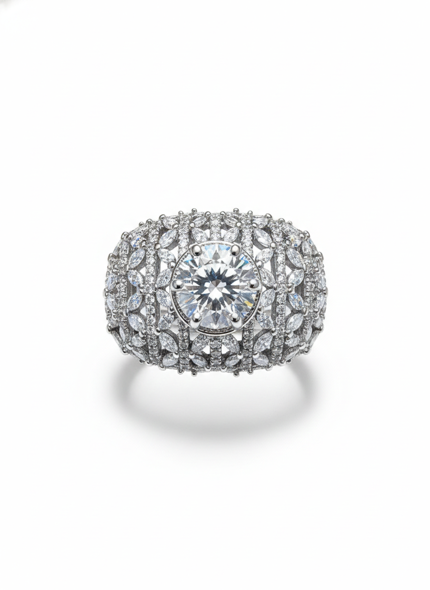 This ring showcases an intricate lace-like dome of shimmering pavé work, creating a luxurious tapestry of light and texture. At its centre sits a brilliant round stone, framed beautifully by the ornate openwork design. Bold, architectural, and opulent, it feels like a miniature crown sculpted in diamonds—strikingly elegant from every angle.